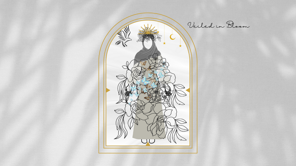 Wrapped in soft florals and crowned in celestial grace, Veiled in Bloom honors the journey of becoming—one often undertaken in stillness and solitude. The gentle figure, cloaked in calm hues and surrounded by butterflies and blooms, reflects the beauty of what is hidden, nurtured, and ready to emerge.